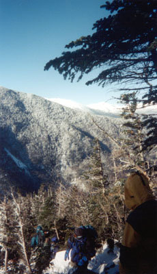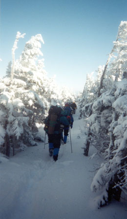 At 6:15, we finally arrived at the trailhead. The thermometer on my jacket zipper read minus 5, but this may have been optimistic. As the warm, moist air from my breath condensed on my eyelashes, tiny ice crystals formed; each time I blinked, my upper and lower eyelashes would freeze together, giving a disconceriting feeling of stickiness each time my eyes reopened. The cold temperatures kept us moving, forcing us to make record time on the 3.8-mile ascent to the Carter Notch Hut, one of the many cabins operated year-round by the Appalachian Mountain Club.