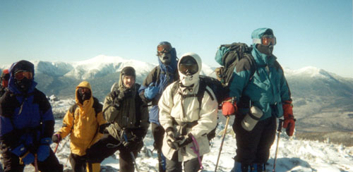 As anticipated, Mt. Hight offered stunning views of Mt. Washington and the surrounding peaks. However, 40-mph winds limited our westward gazes to no more than a few seconds before we would have to turn away to thaw. At wind chills of -25, exposed skin can freeze in 60 seconds; in these conditions, with wind chills approaching -80, we had to be careful to cover every bit of skin. I slipped my goggles off for a few seconds to take a some photos, but we soon had our fill of the bitter cold and opted to head down to a less exposed area.