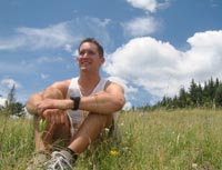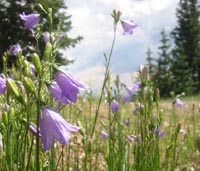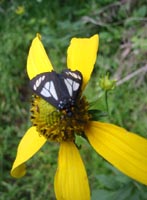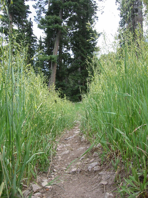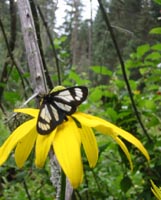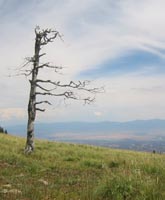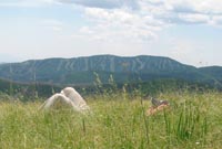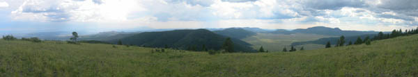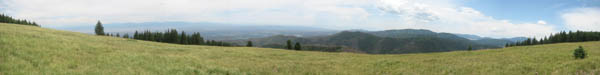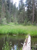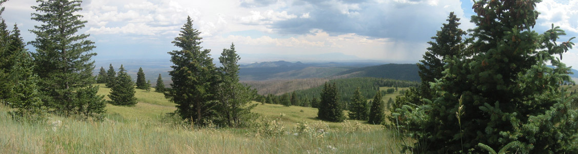 At the base of the canyon, the trail continued to the east past a series of quiet marshes, alive with butterflies. As I turned north onto Trail 277, the route became less maintained, but still easy to follow. Fallen trees and spurious animal trails occasionally made navigation more difficult, but it was always easy to find my way back to the right trail - marked by yellow or pink ribbons. The trail climbs the west face of the mountain, so the landmark meadow was not visible until the very summit. I emerged from the forest at 1:04pm, greeted with a spectacular 180-degree view from Espanola down to the Sandia Mountains.