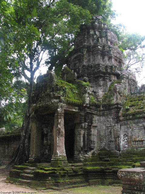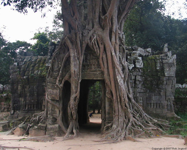 with towering trees dominating the monolithic architecture. Cambodian