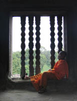 the corridors, their bright orange robes dwarfed by the grey stone